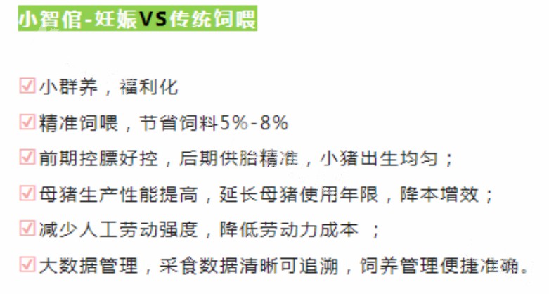 妊娠舍:可实现猪只妊娠阶段转入分娩阶段的全进全出,配备智能饲喂设备小智倌-妊娠,以达到妊娠母猪的群养和个体精细化饲喂管理。