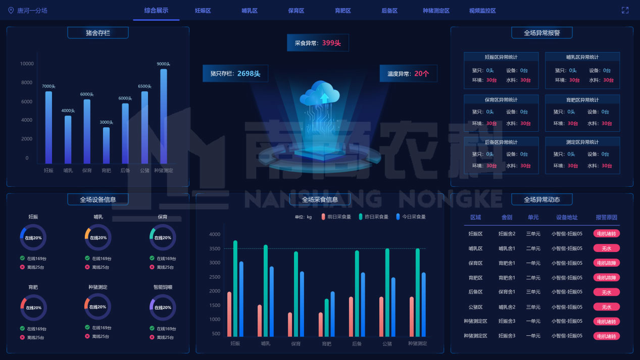 在重庆琪金集团所属的荣昌猪资源保护场和扩繁场中,老板只需在手机上打开南商云数据管理系统,通过简单的操作后就可以清楚地了解猪场各方面的数据,比如设备运行状态、猪只的采食数据、猪场能耗、温湿度、猪只采食异常、设备异常、供料供水异常报警等都可一手掌握,还能一键下发饲喂方案: